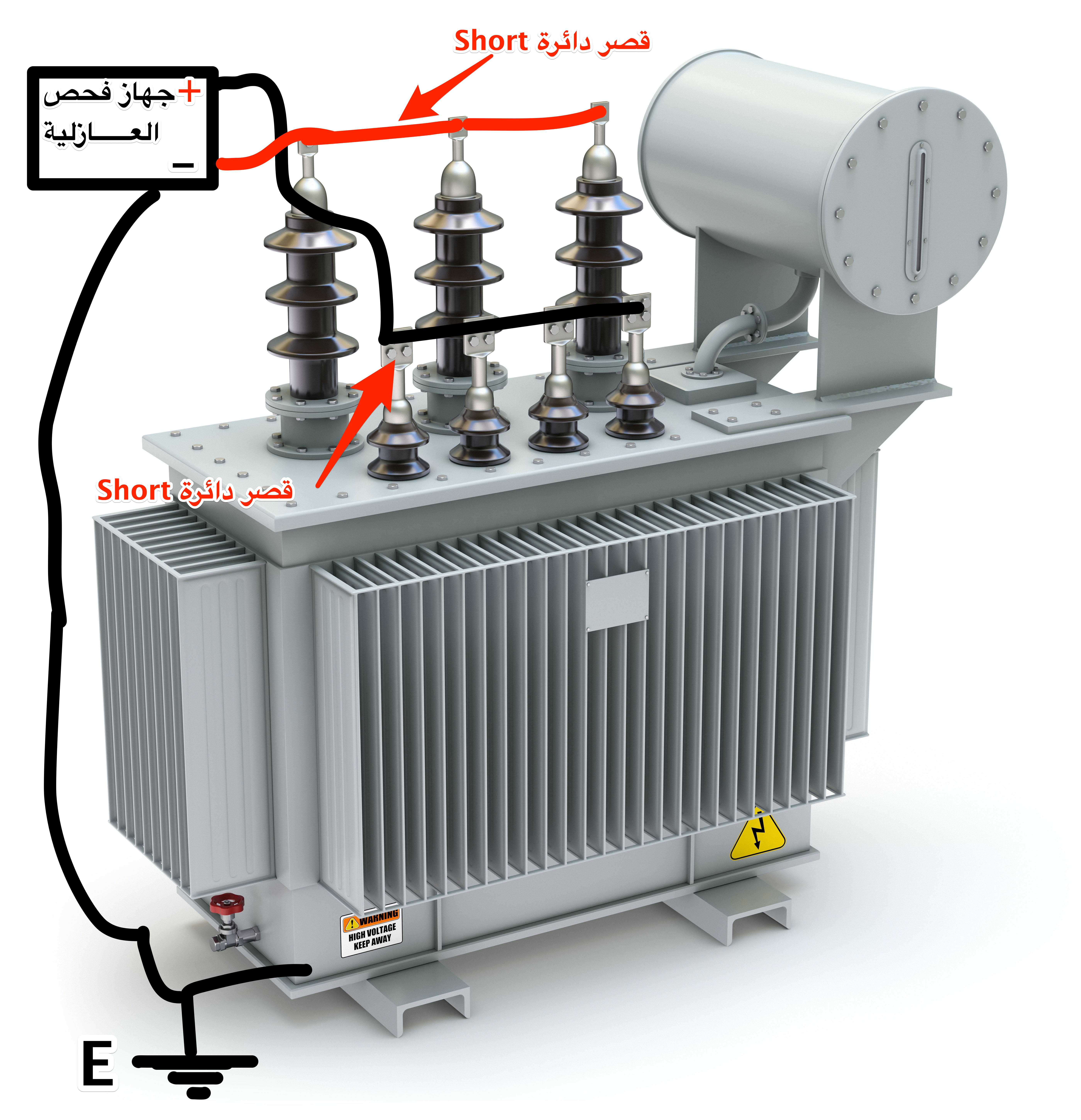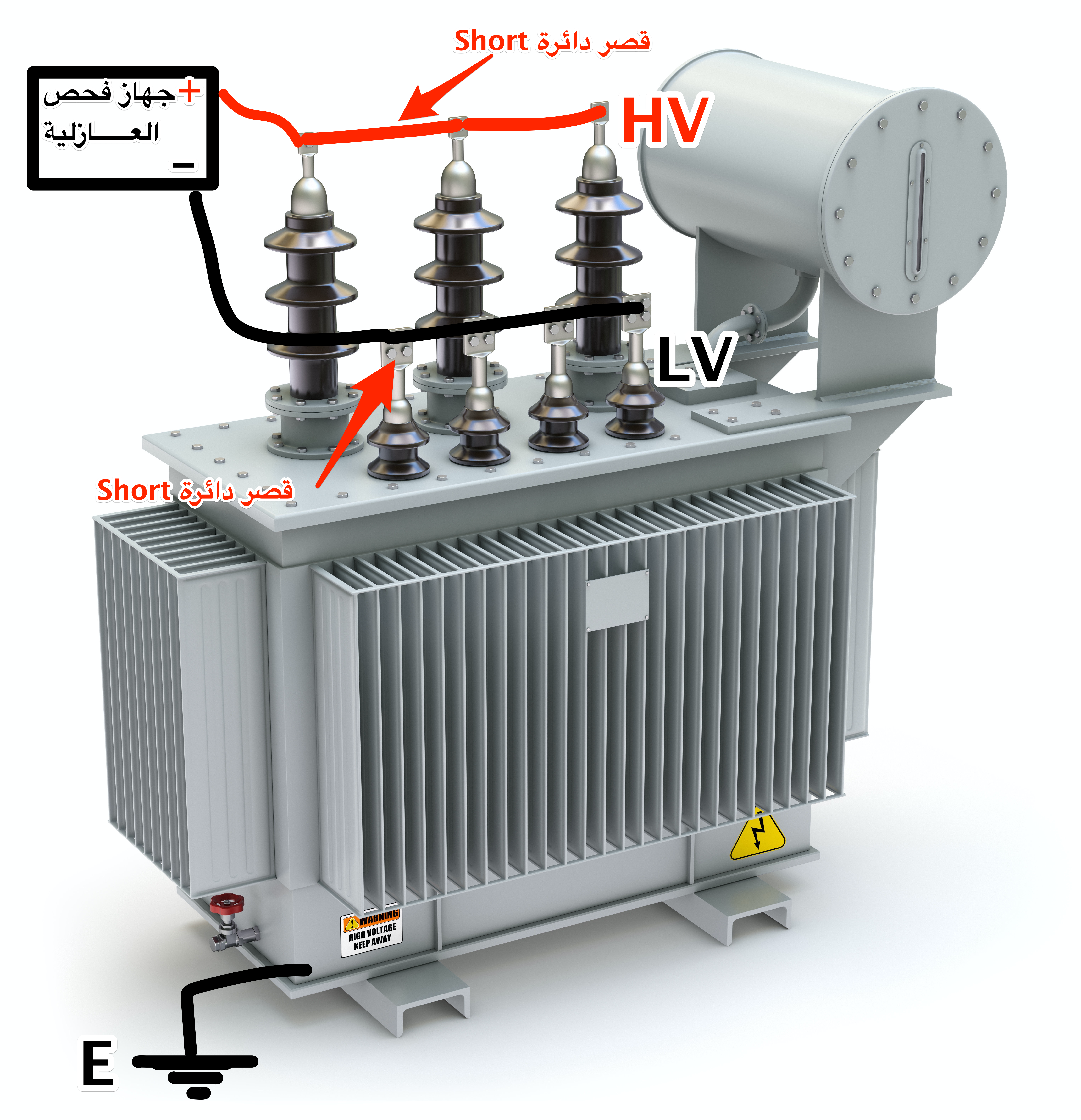 - تأريض ملفي المحول العالي والمنخفض للتخلص من الشحنات الكهربائية المستقرة في ملفات المحول، حيث أن وجودها يؤثر في دقة قراءة قياس مقاومة العازلية.